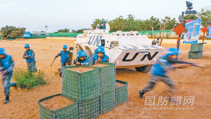 近日,中國第15批赴蘇丹達爾富爾維和工兵分隊,結(jié)合任務(wù)區(qū)安全形勢,嚴密組織營區(qū)綜合防衛(wèi)演練,確保遇有突發(fā)情況,能夠及時應(yīng)對、有效處置。圖為官兵正在進行班組協(xié)同演練。楊邦照攝