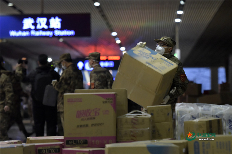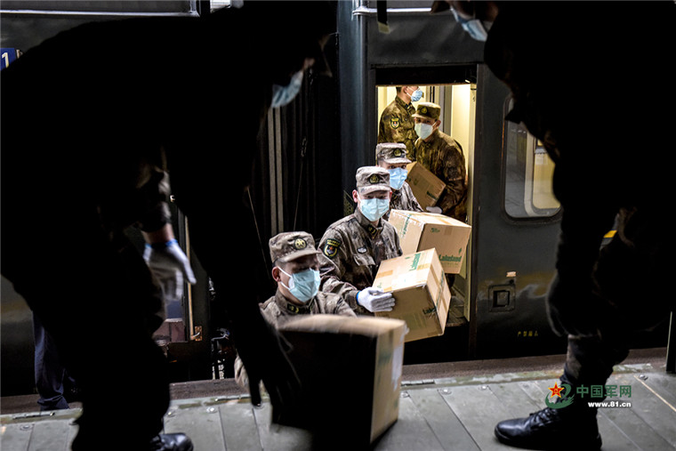 1月26日上午,全軍首批從遼寧沈陽、山東菏澤緊急調(diào)撥衛(wèi)生物資抵達武漢,軍隊前方指揮協(xié)調(diào)組協(xié)調(diào)軍地雙方進行物資交接。圖為官兵在漢口火車站迅速搬運物資。解放軍報記者 范顯海 攝