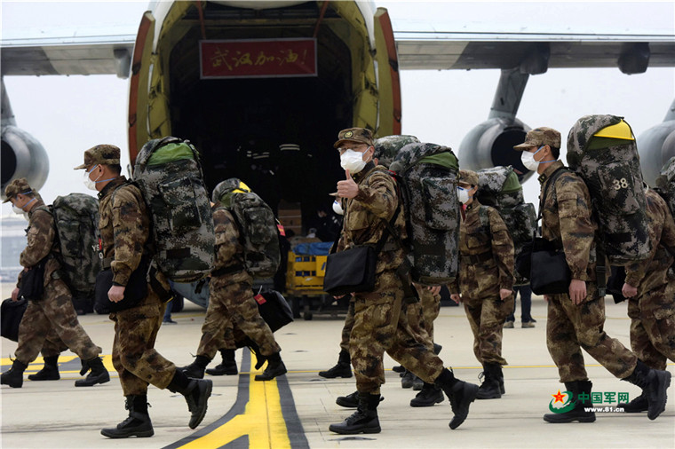 空地聯(lián)運,軍隊又一批1200名醫(yī)護人員抵達武漢。解放軍報記者 范顯海 攝