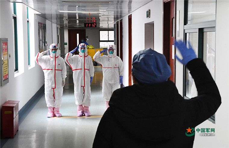 2月1日,陸軍軍醫(yī)大學(xué)醫(yī)療隊收治首批患者中兩人治愈出院。千言萬語化作軍禮致意。解放軍報記者 范顯海 攝