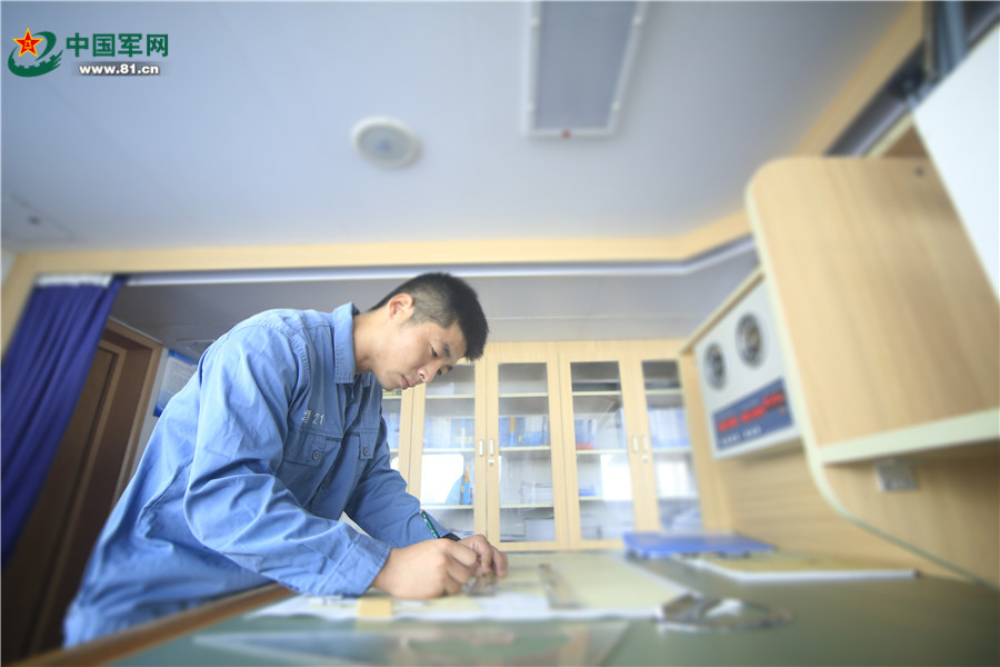 遠(yuǎn)望21號船船長李進(jìn)正在進(jìn)行海圖作業(yè)。