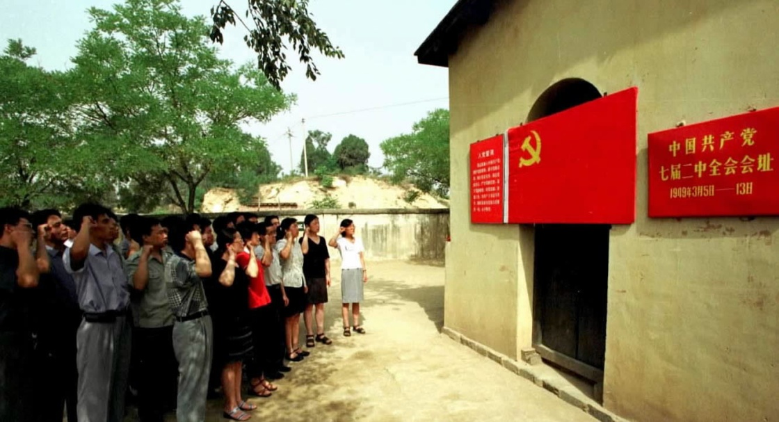 新黨員在黨的七屆二中全會(huì)會(huì)址舉行入黨宣誓儀式(2001年7月1日攝)。新華社記者 周文廣 攝