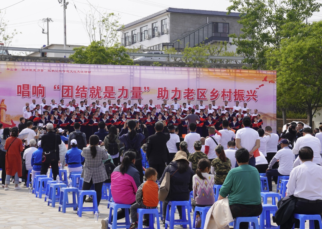 2021年4月26日在河北省平山縣北莊村中宣部舊址廣場拍攝的合唱表演。新華社記者 李夢(mèng)嬌 攝