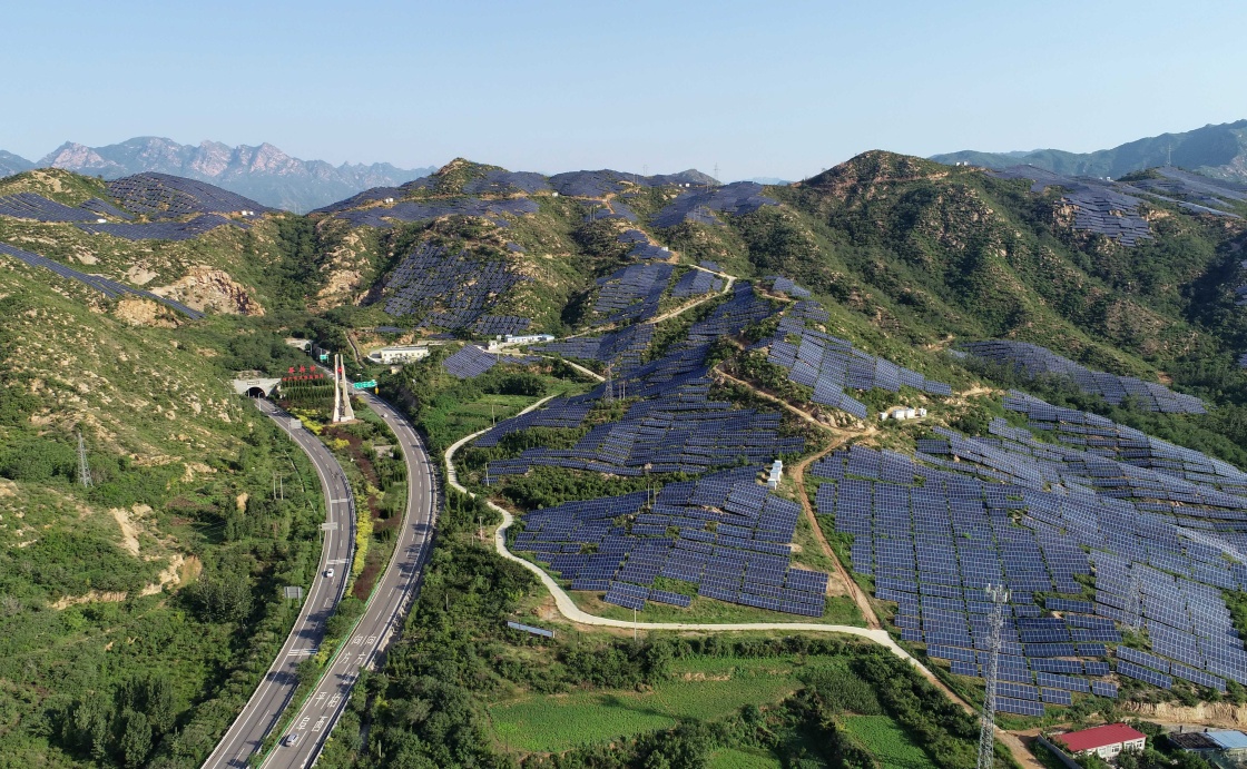 通往西柏坡的高速公路和西柏坡鎮(zhèn)一處荒山上的光伏發(fā)電場(2019年8月16日攝,無人機(jī)照片)。新華社記者 楊世堯 攝