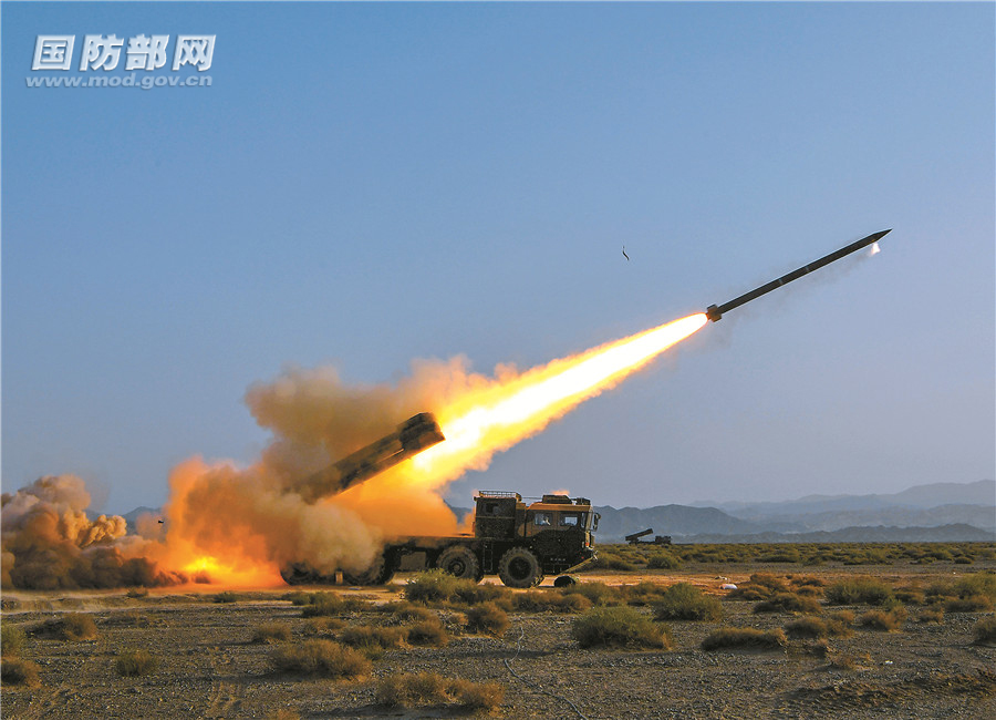“5、4、3、2、1,發(fā)射!”7時整,伴隨指揮員的發(fā)射命令,數(shù)十枚火箭彈似一顆顆流星在戈壁上空劃過,飛向“敵”陣……實時畫面顯示,所有炮彈準(zhǔn)確覆蓋目標(biāo),“敵”陣遭到重創(chuàng)。
