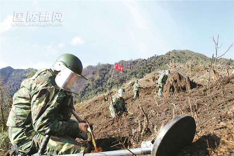 這一幕,是每名搜排手歷盡艱辛排雷作業(yè)的生動(dòng)縮影。搜排完畢,官兵們把鮮艷的五星紅旗插在雷場(chǎng)。離開雷場(chǎng)前,他們站在山頂眺望遠(yuǎn)處。視野中,他們戰(zhàn)斗過的一些雷區(qū),如今已辟成良田,長(zhǎng)滿了山茶、草果……