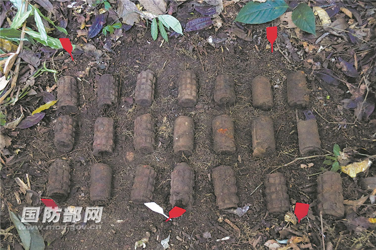官兵將搜排出的地雷放在一起準(zhǔn)備集中銷毀。