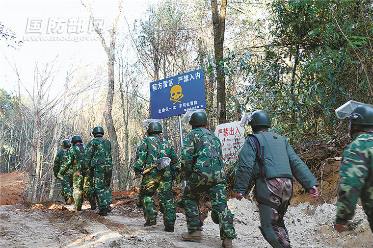 身著厚重防護(hù)服的掃雷官兵,沿著山路徒步走向雷區(qū)。