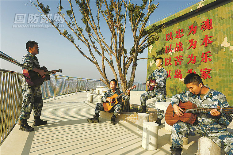 休息時,“小島樂隊”彈起吉他,讓孤寂的守島生活多了幾分歡樂。