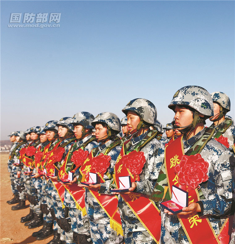 參訓(xùn)女兵圓滿完成訓(xùn)練后,身披綬帶紅花,獲得首次跳傘紀(jì)念證章。