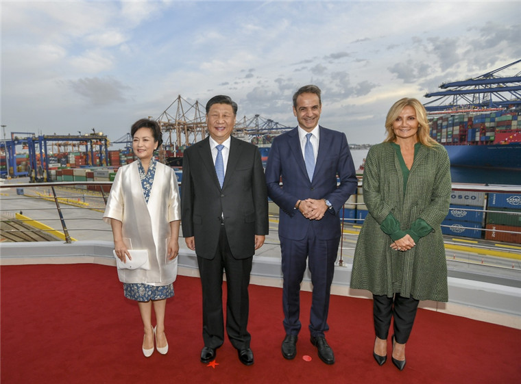當(dāng)?shù)貢r間11月11日,國家主席習(xí)近平和夫人彭麗媛在希臘總理米佐塔基斯夫婦陪同下,共同參觀中遠海運比雷埃夫斯港項目。這是習(xí)近平和夫人彭麗媛同米佐塔基斯夫婦在港口樓頂平臺合影。新華社記者 謝環(huán)馳 攝