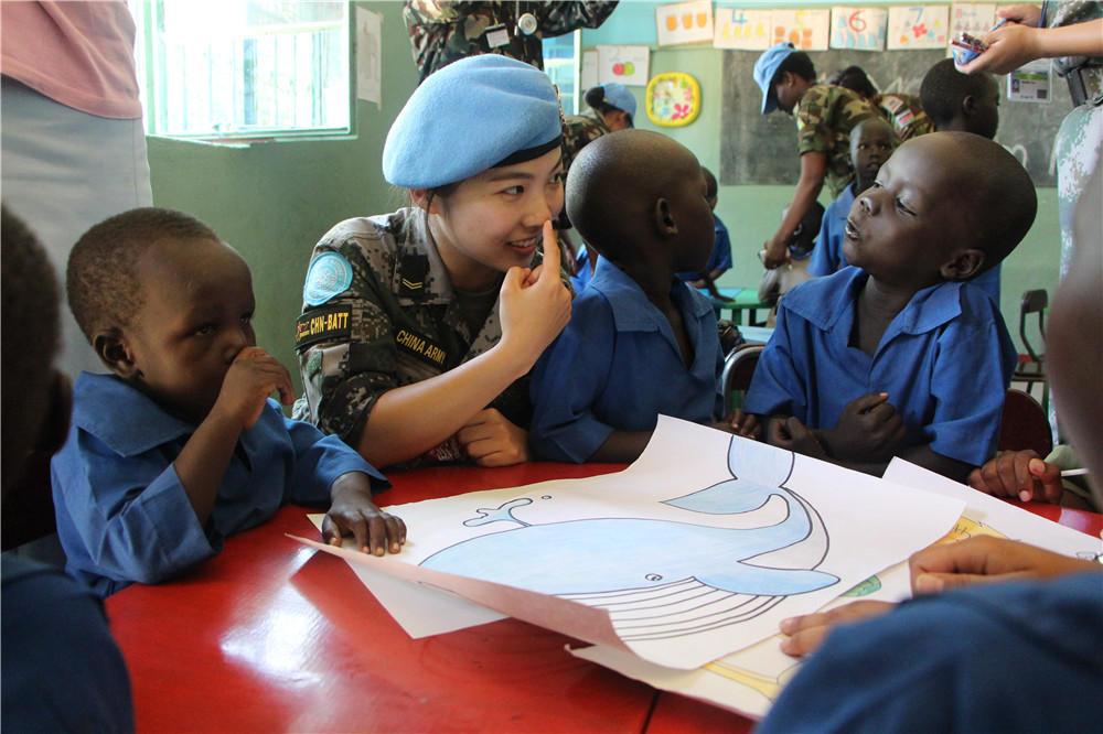 ??????? 維和步兵營女兵到當(dāng)?shù)匦W(xué)幫助兒童。