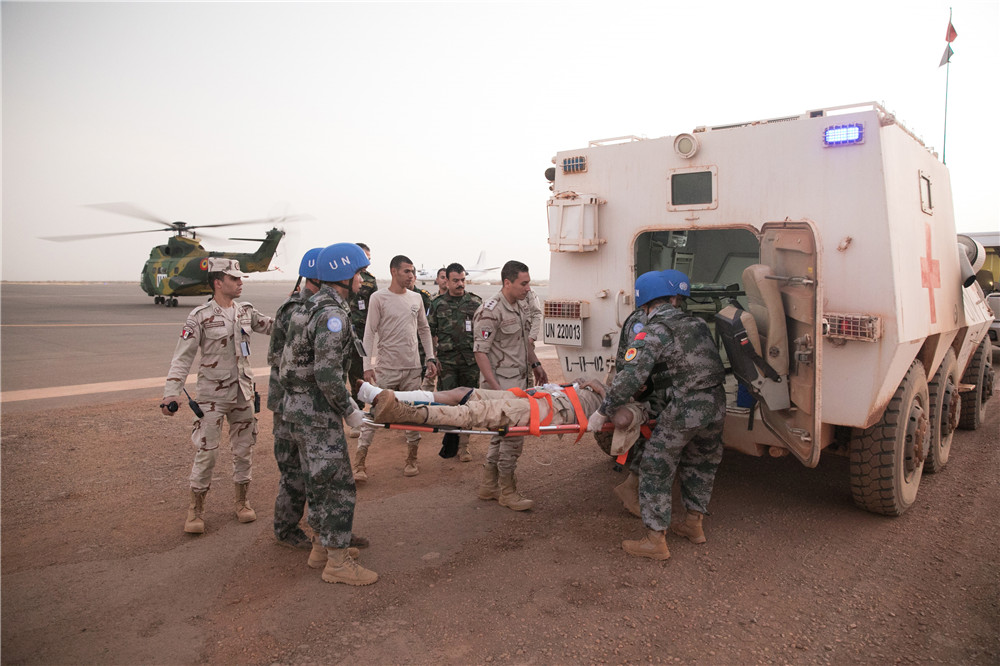 中國赴馬里維和醫(yī)療分隊(duì)將傷員轉(zhuǎn)運(yùn)至裝甲救護(hù)車。