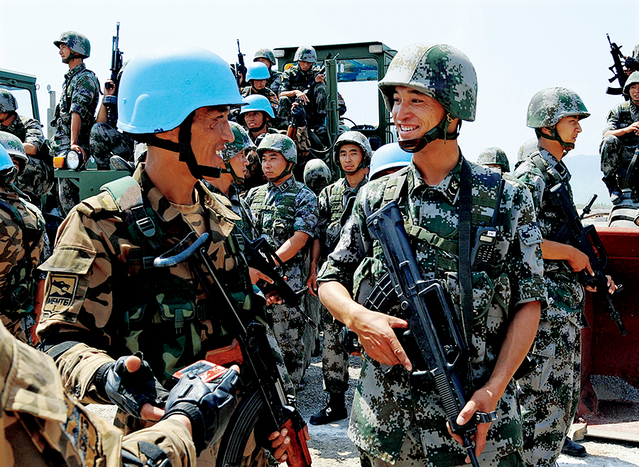 2009年6月中國(guó)與蒙古舉行維和聯(lián)合演習(xí),中蒙兩國(guó)官兵進(jìn)行交流。