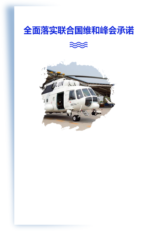 2015年9月28日,中國(guó)國(guó)家主席習(xí)近平出席聯(lián)合國(guó)維和峰會(huì),宣布支持聯(lián)合國(guó)維和行動(dòng)的6項(xiàng)承諾。中國(guó)軍隊(duì)堅(jiān)決貫徹落實(shí)習(xí)近平主席決策部署,言必信、行必果,以實(shí)際行動(dòng)履行相關(guān)承諾,取得一系列重要成果。